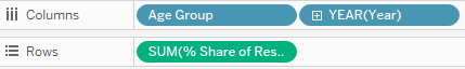 Drag Age Group and Year from Dimensions to Columns and % Share of Resident Labour Force from Measures to Rows.