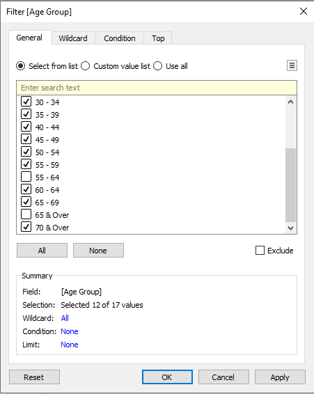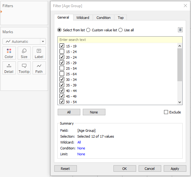 The aggregated age groups for LFPR are already available in the dataset so we just need to click on the Age Group filter and select Edit Filter.