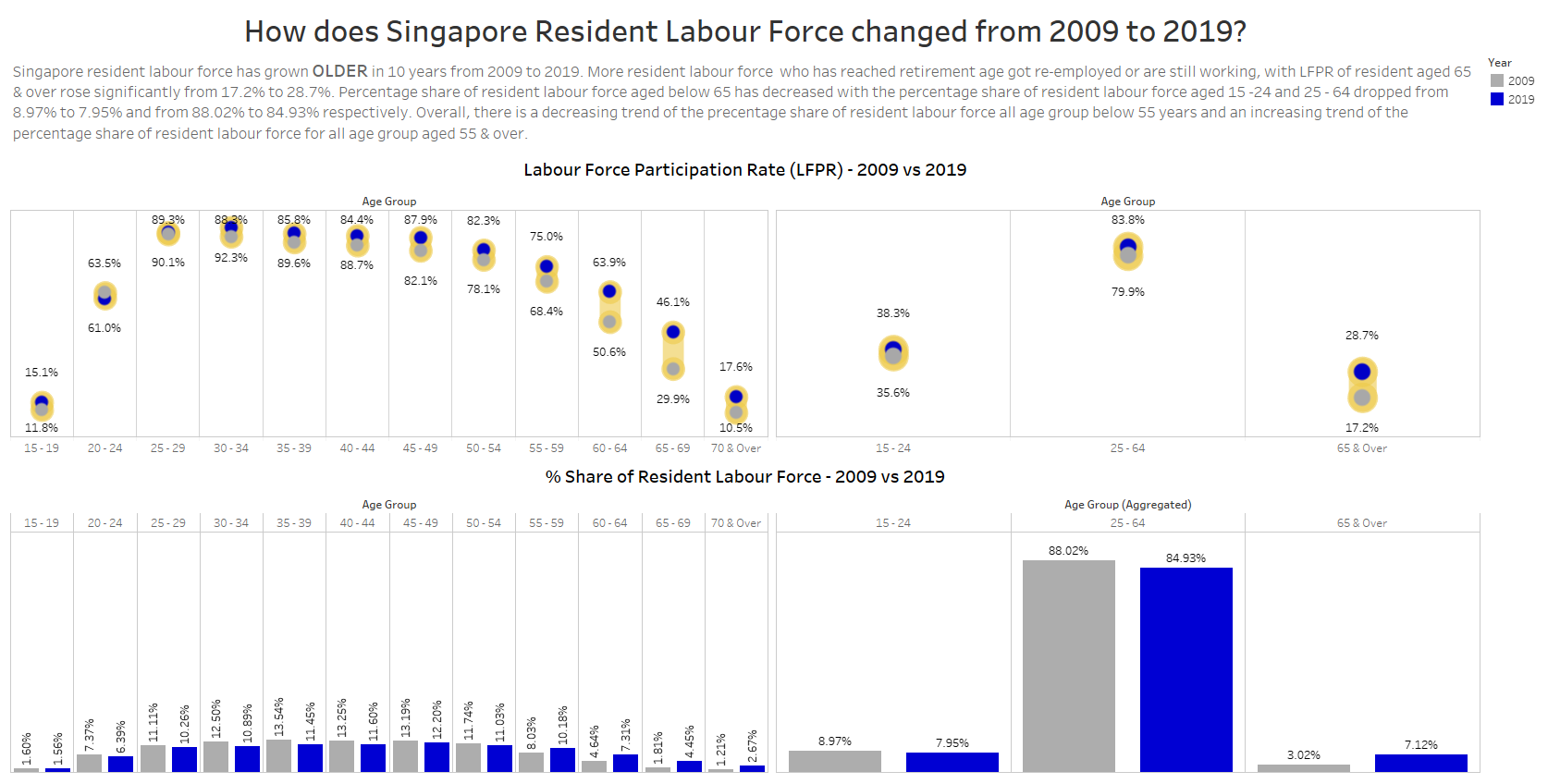 For the dashboard, we inserted a more explanatory title “How does Singapore Resident Labour Force changed from 2009 to 2019” at the top and a clearer lead-in statement stating the overall finding of the visualisation which is that the Singapore Resident Labour Force has gotten OLDER from 2009 to 2019.