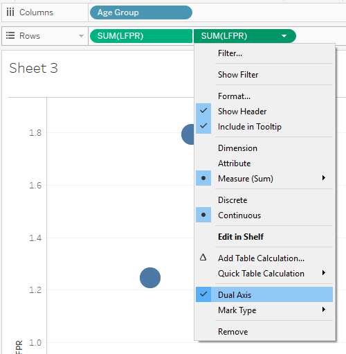 Drag Age Group from Dimensions to Columns and LFPR from Measures to Rows2 times. Right click on one of the LFPR and select Dual Axis.