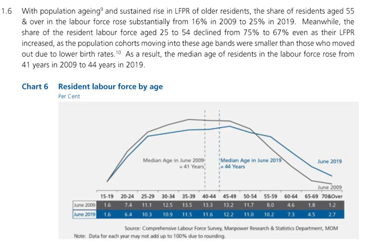 The resident labour force has gotten older with more and more elderly/potential retirees (aged 65 & above) remaining in the workforce. Labour force aged 65 and above has % share of resident labour force of 7.12% in 2019, up from 3.02% in 2009.The LPFR for the same age group has increased more than 10% from 2009 to 2019.