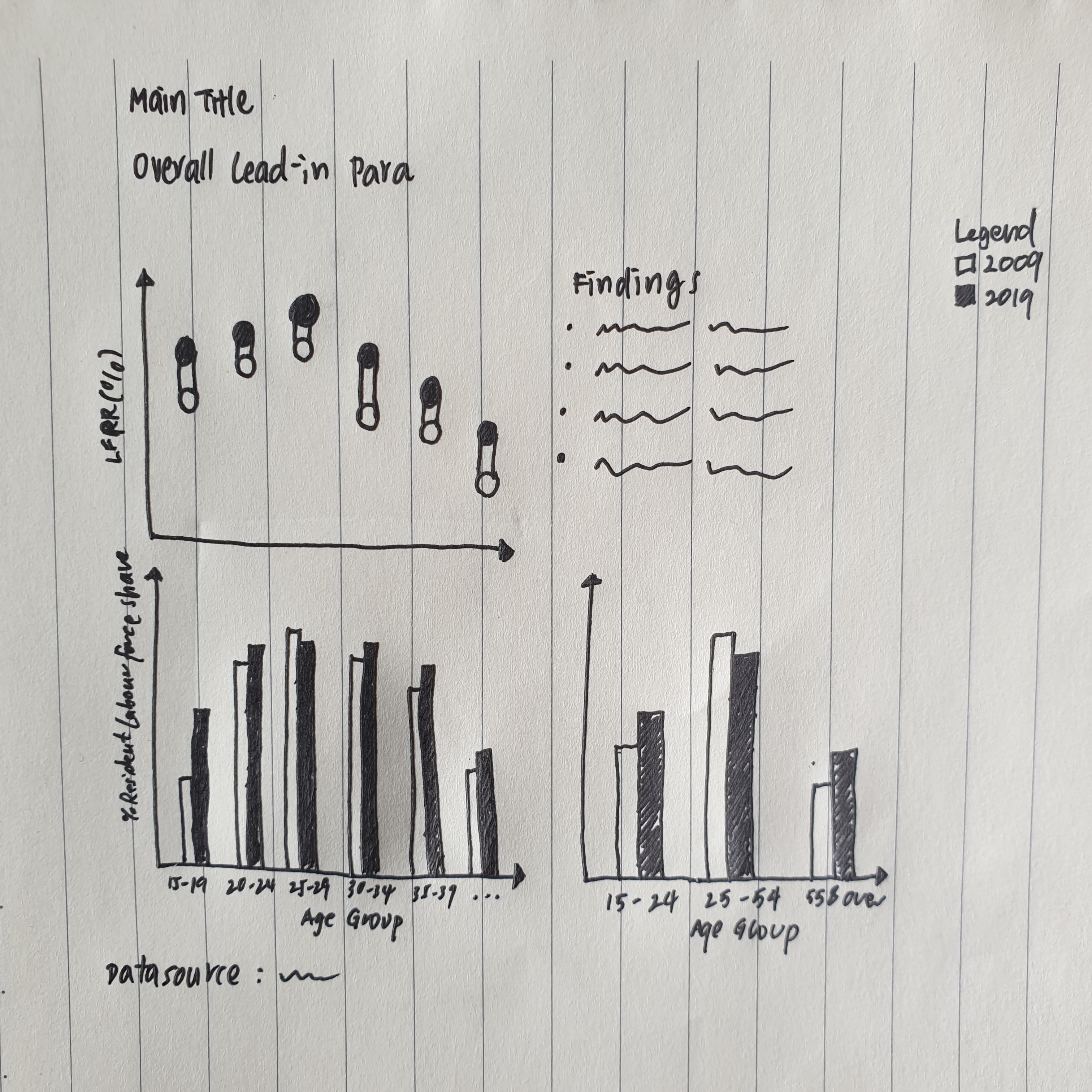 Additional chart is added to show how LFPR has changed for the different age groups from 2009 to 2019. It is also strategically placed on top of the revised side-by-side bar chart to align the x-axis (Age Group) for better comparison. A dumbbell chart is used to better portray the magnitude of the changes in each of the age group from 2009 to 2019.