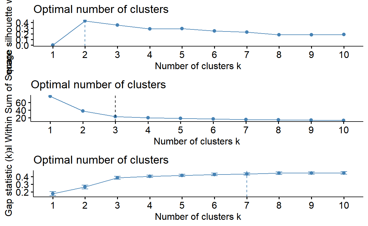 Based on the 3 methods, the best bet is to use 2 or 3 as the optimal number of clusters. For this project, we chose the optimal number of clusters to be 3.