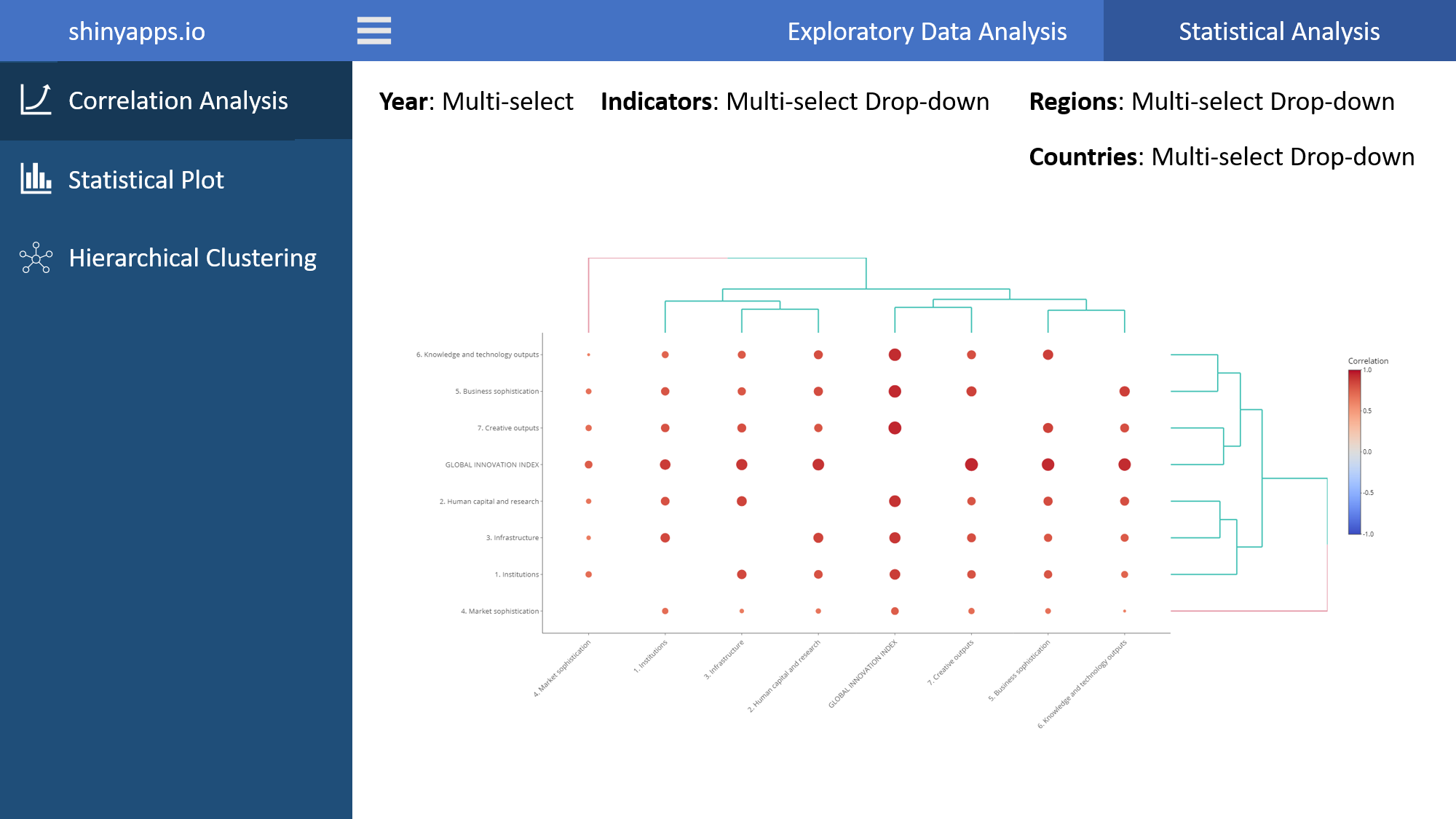 The current correlation plot only consists of the 7 main indicators and only for year 2020. However, we have over 100 over sub-indicators for us to perform correlation analysis on and 6 years of data. Therefore, for our shiny app, we are going to allow users to interactively select: