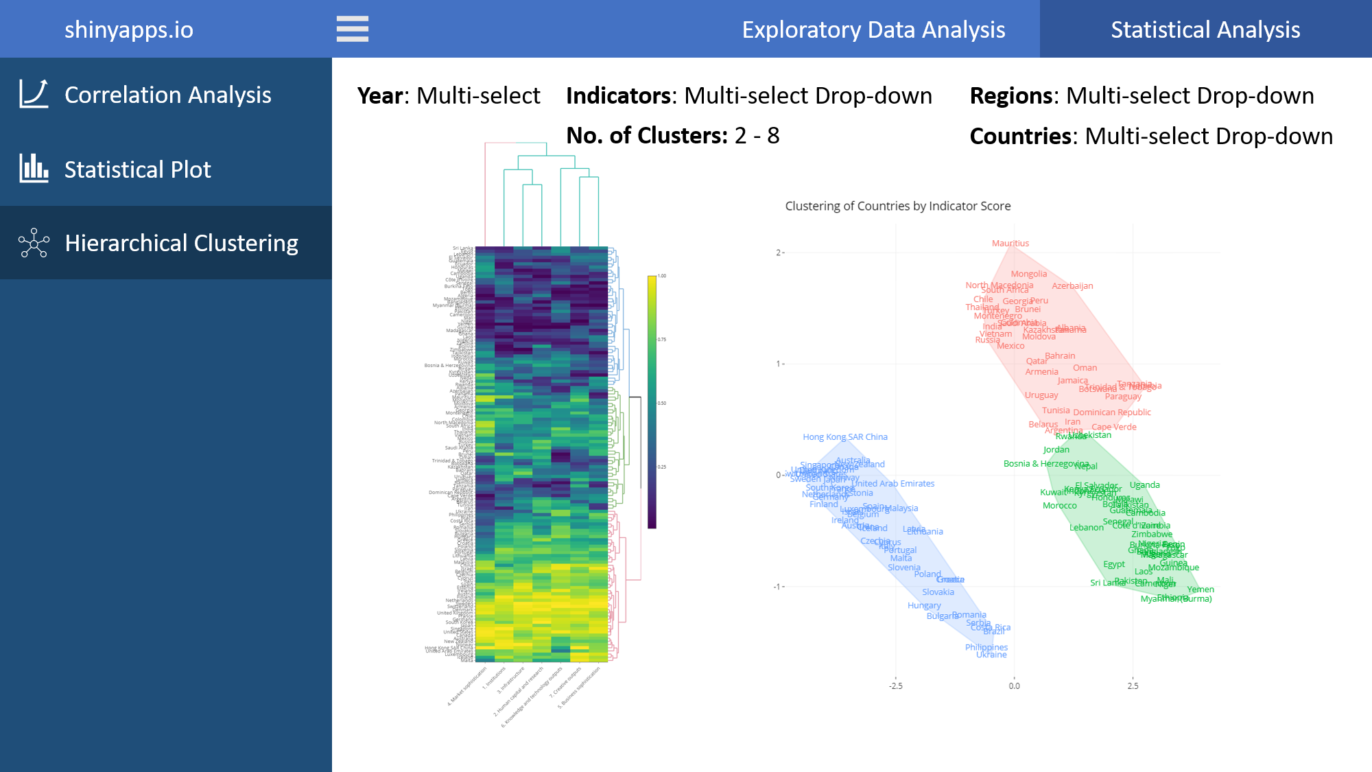 The current hierarchical clustering only consists of the 7 main indicators for year 2020, and also fixed at 3 clusters. Therefore, for our shiny app, we are going to allow users to interactively select: